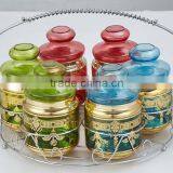 | glass storage jar | glass vase | glass water bottle | mosaic glass candle holder |