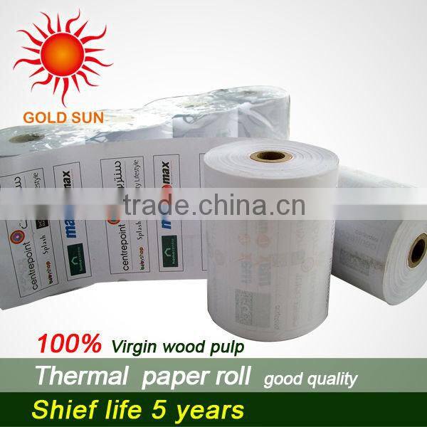 1) 55gsm or 59gsm thermal paper, good quality, long time of living , can be cut for fax paper roll, cash regisger roll etc.