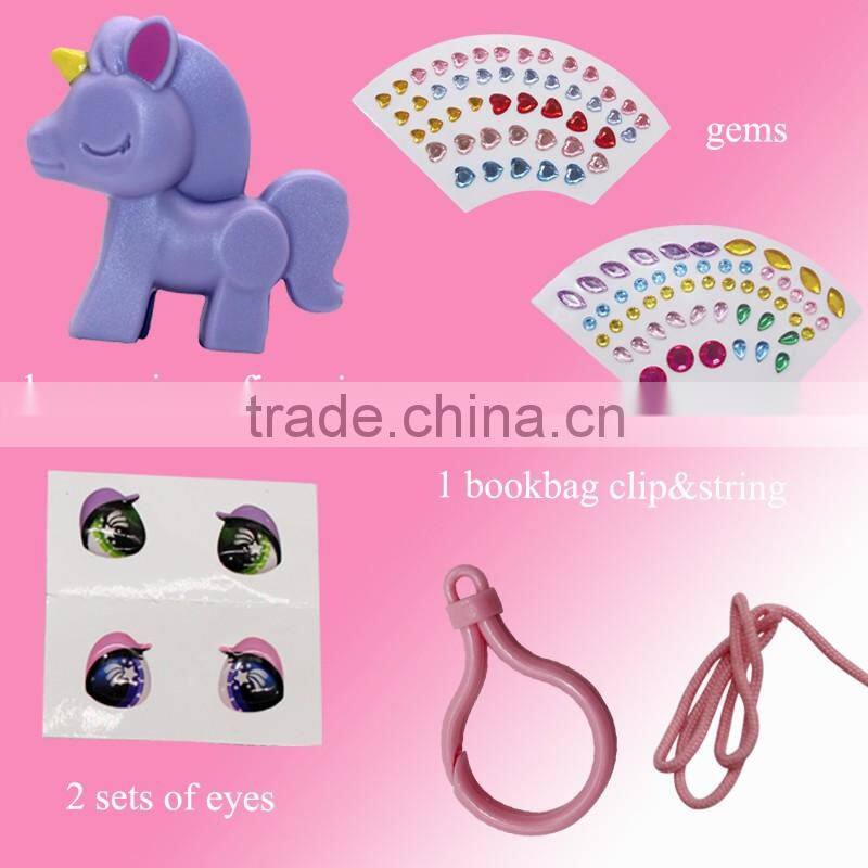 Includes:1pc unicorn fingurine+2 sets of eys+gems+1 pc bookbag clip+string