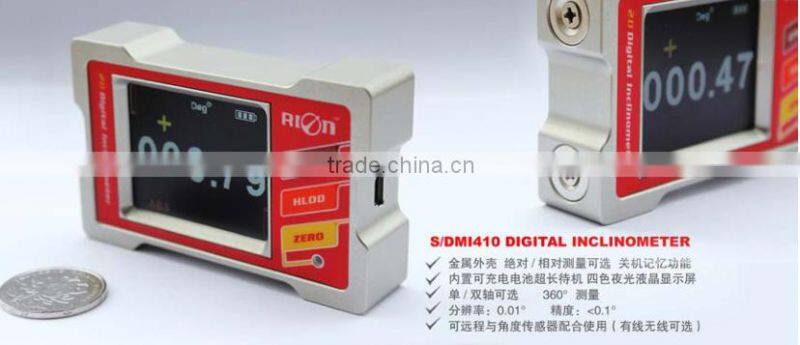 DMI410 is a digital display inclinometer which took RION company three years to develop professional for various industy angle controling and measuring.Thecore of this product is using the micro-mechanical control principle, dual-core measurement unit,can use the Y-axis to compensate X-axis during the measurement process,and then to use RION patent interleaved and temperature compensation model algorithm to play absolute operation advantages of the micro-mechanical electronic principles,to ensure that the instruments measurement with the long-term stability and repeatability. DMI410 is a uniaxial 360deg measurement, resolution 0.01 °,accuracy <0.1 degree full-scale,fast response, stable data, products specially designed for the sides and bottom with magnetic adsorption installation, both sides of the benchmark can be measured and using normally,very convenient to use, In addition, supporting the selection of DMI410 (SMI410) with the use of separate measurement, used in combination with the Division LCA series tiltsensor, the transmission mode wireless or wired optional, wireless using one-to-one band transmission, transmission straight line distance> 10m, the cable transmission standard 1 meter (can be customized long distance), DMI410 series has strong scalability, convenient & practical application and industrial reliability, has absolute cost advantage and has an absolute competitive advantage in the international market !