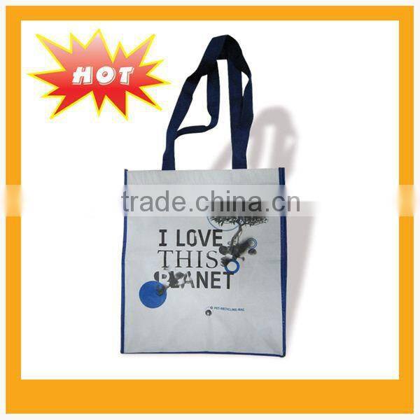 It is a synthetic fibre, it used to be a plastic bottle, such as beverage, food and other liquid containers. The PET material in our bags is based on 100% recycled PET fabric. The 14 needles material can be laminated directly, but 22 needles material can be silkscreen or hot transfer printing, the bags are 100% recycled.