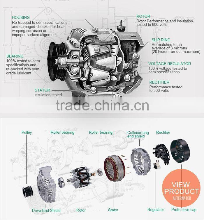 | ALTERNATOR | 1.Premium cores and precise OE assembly benchmarks 2.Design to meet the grueling heat and electrical requirements 3.First Time Fit provides perfect mounting with no belt/pulley alignment issues |