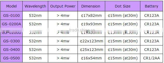 | Model | Wavelength | Output Power | Dimension | Dot Size | Battery |