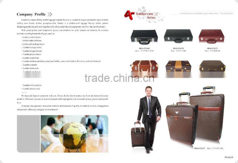 Guangzhou Shi Molike leather Products Co. LTD is a professional luggage company covering hundres of types, such as, jewelry boxes, make-up boxes, office supplies , leather cases and so on, which gathers designing, producing, and sales together. At the same time, there are high quality and resonable price, even strong company image. Since the company was founded, there are many customers around the world including Italy, Dubai, India, UK, Korea and so on.
