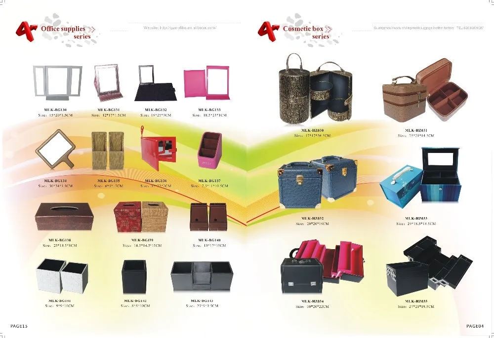 Guangzhou Shi Molike leather Products Co. LTD is a professional luggage company covering hundres of types, such as, jewelry boxes, make-up boxes, office supplies , leather cases and so on, which gathers designing, producing, and sales together. At the same time, there are high quality and resonable price, even strong company image. Since the company was founded, there are many customers around the world including Italy, Dubai, India, UK, Korea and so on.