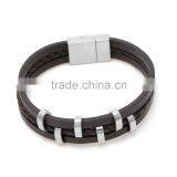 Brown Magnetic Clasp Leather Bracelace 3 Layer Braided With Stainless Steel Ring Leather Bangle