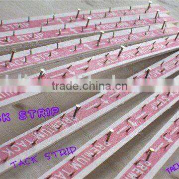 we have introduced advanced foreign nail strip production equipment,we can produced all specifications according to Client needsA tack strip is an instrument used in the installation of carpet. The tack strip is a thin piece of wood, between 1 and 2 meters long, studded with hundreds of sharp nails or tacks . The tack strips are nailed, tack side up, to the perimeter of the area being carpeted. Once the underlay is installed, and carpet is stretched over the area, the carpet is firmly anchored to the floor via the tack strips. This prevents the carpet from coming loose over time.