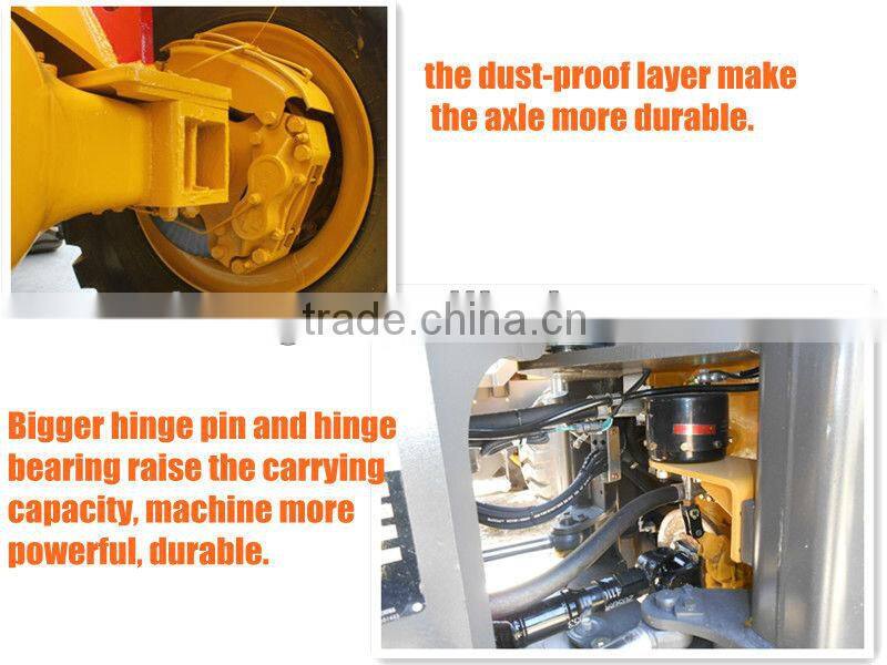 3).Details in Structure: Besides the special design of structure, full steel plate thickening, the thickness of lift arm and hinge plate reaches 60mm. Bigger hinge pin and hinge bearing raise the carrying capacity, machine more powerful. The exclusive dust-proof layer and sealed articulated points make the loader more durable.