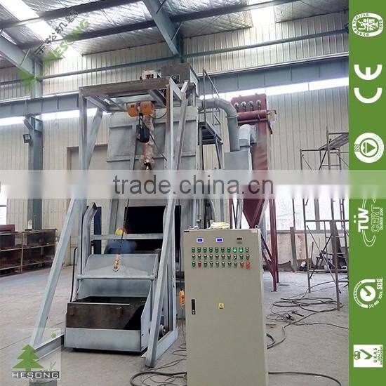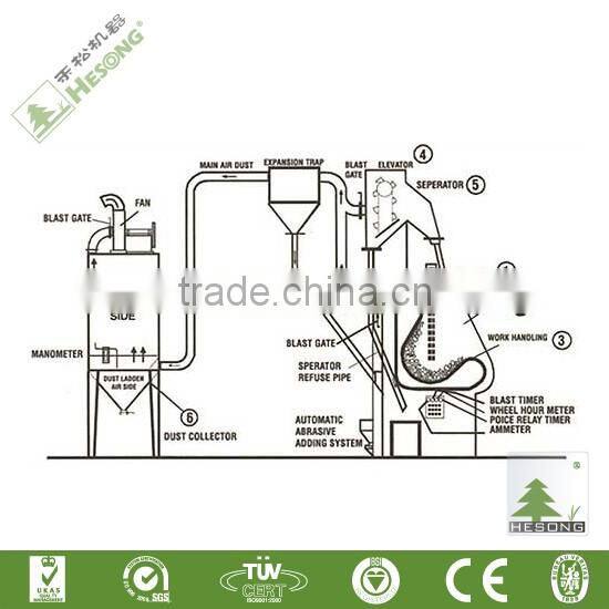 After the specified number of artifacts are added to the room, the door closed, and the machine started to work, the workpiece began to turn under the drive of the drum, at the same time blasting device of high-speed projectile fan beam formation, evenly hit the workpiece surface, thus achieving the purpose of cleaning. Throw rock and sand holes come into the bottom of the screw conveyor from the caterpillar, the screw conveyor come into the elevator, the elevator mentioned separation in the separator. Dusty gas is filtered in the filter through the fan, and then becoming the clean air into the atmosphere, the dust blow into the filter dust by air at the bottom of the box, the user can be cleared on a regular basis. Used sand pipe flow by the waste, the user can reuse. Pill sand mixture recycled into Chambers by recycle tube , it can be recycled after being separator separation.
