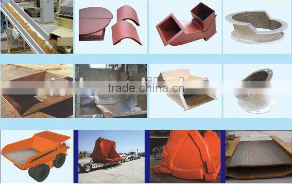 3.Metallurgy: hopper lining, surface of slope conveying, net screener, bell cover of boiler, material cart, strong stainless plate of boiler, sintering feeding tube, pipes, distribution plates, slag trough, air exhauster, etc.