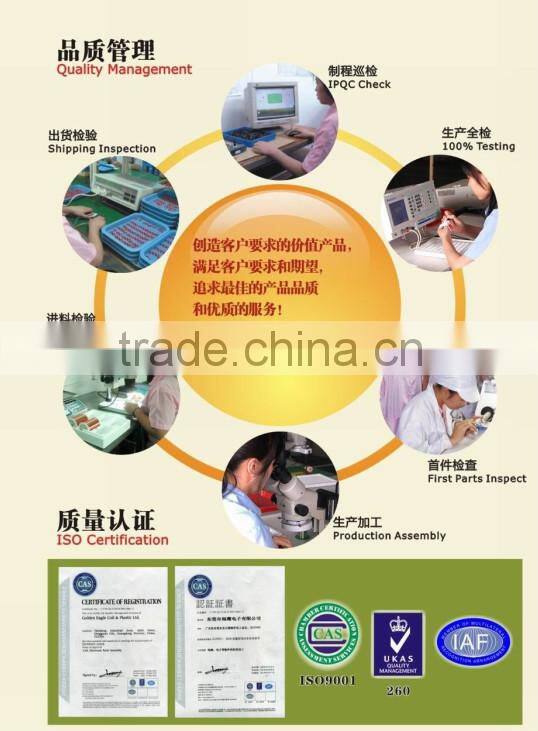 Golden Eagle Coil & Plastic Ltd is a professional large-scale manufacturer of all types of air core coil, Our company was established in 2003, and we have more 25 years of history in coil industry. integrating R&D, production, and sales together. we have three factories in jiangxi province,jinyang electronic ltd is the firsr branch. Our main products include, wireless coil, HollowSelf-bonding Coil, Inductor Coil, toy Coil , RFID Coil, Sensor Coil, air core coil and trigger coil ,bobbin inductor coil ,R-core indutor coil ,Antenna inductor coil ,RFID inductor coil ,Access Control Products.