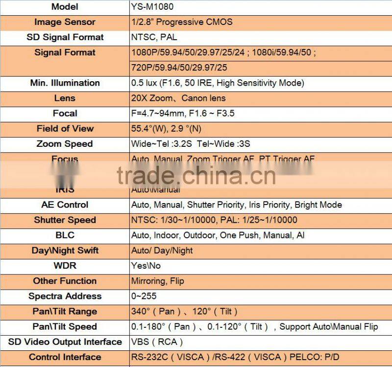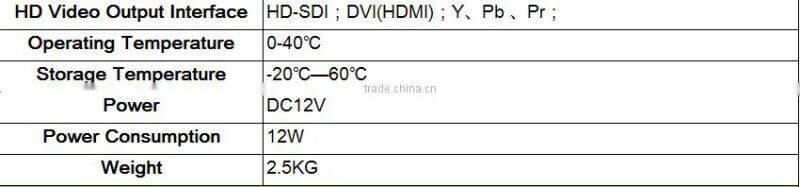 6.A variety of control interface: RS-232C (VISCA protocol)/RS - 422 (VISCA protocol)/PELCO: P/D.And HD output interface: HD-SDI