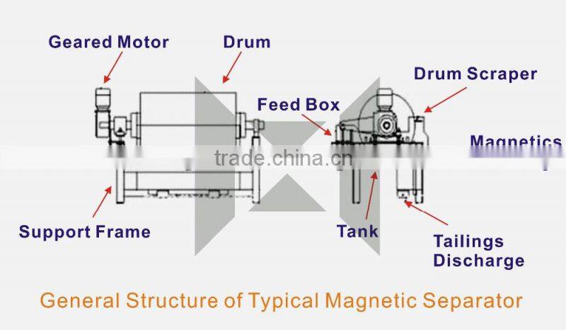 It's applied for particle size less than 3mm magnetite, pyrrhotite, limonite and other materials, wet magnetic separation, but also for coal, non-metallic minerals, building materials and other materials in addition to iron work. Available downstream, semi-reflux, reflux-type and other forms of magnetic separator machine, cylinder surface magnetic field strength can be produced according to the actual use of the special.