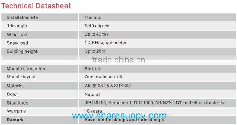 It could be used for commercial and residential roof solar system. According to different support back pole, the angle could be adjustable from 5 to 45 degree. We finished maximum pre-assembly in factory to ensure significant labor saving for customers. What’s more, this system won’t need to damage concrete roof. Accurate designing and pre-installation eliminates cutting in project place, and make the fastest installation possible. High quality metal material and subsequent process make the mounting system for long time anticorrosive. Static calculation and test will ensure our promise to customers, stable and reliable.