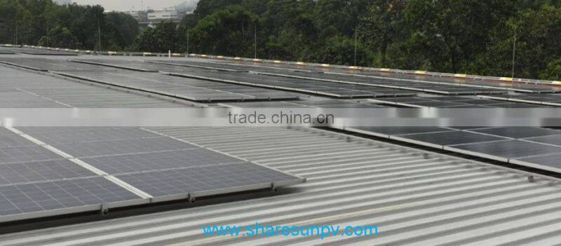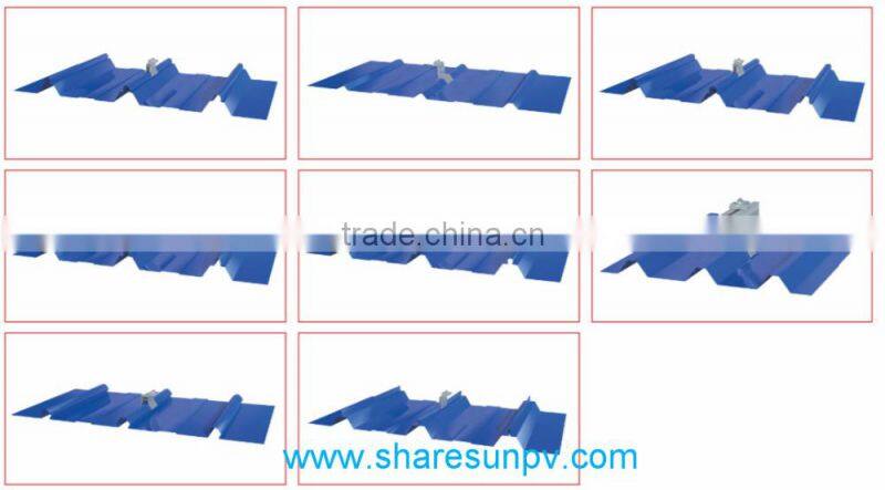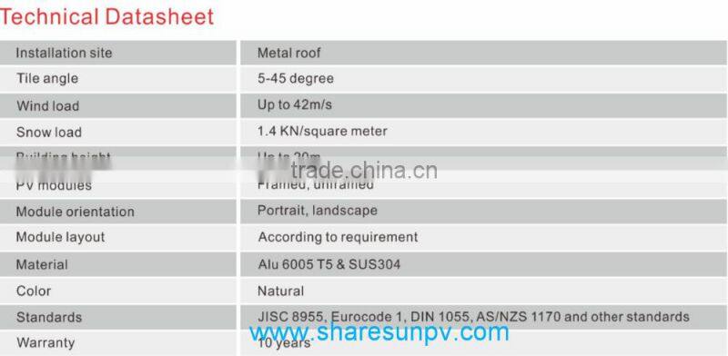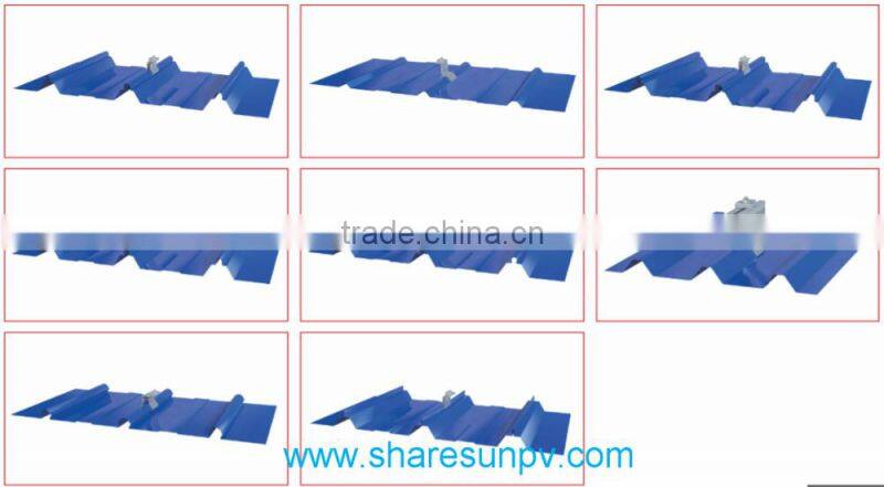 Metal roof mounting is an universal system for metal pitched roofs. It could be used for commercial and residential roof solar system. We have developed many kinds of clamps for different metal shape roofs. We finished maximum pre-assembly in factory to ensure significant labor saving for customers. Accurate designing and pre-installation eliminates cutting in project place, and make the fastest installation possible. High quality metal material and subsequent process make the mounting system for long time