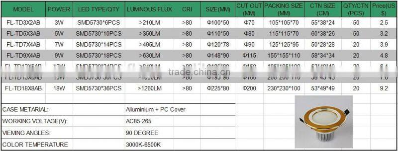 Specification of Golden 3W 5W 7W 9W 12W 18W led downlight with CE :