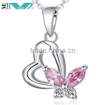 Sterling Silver Pink Stone Butterfly and Plain Heart Necklace