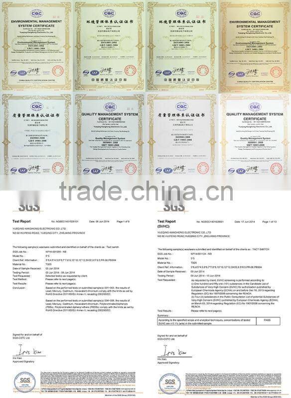 Kanghong Electronic which trademark as khan, we produce high quality electronic switches, product range including tact switch, micro switch, push switch, rocker switch, door lock switch and switch cap etc. Pushbutton switch cap as our main product, developed to multiple series, including 6*6tact switch cap,6*6self-lock switch,12*12 square stem tact switch cap,power switch cap,6*6 square tact switch cap,rocker switch cap. We garauntee our quality and make each switch with excellent quality.
