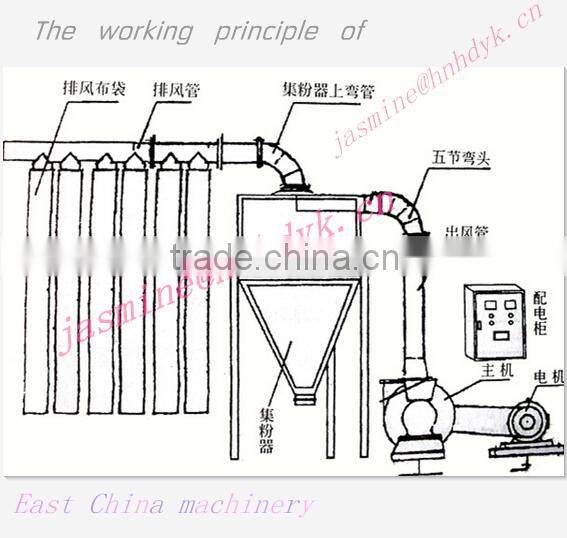Material from the feed port to feed , grinding tools, high-speed rotation after three knives, the material for compression , friction, tearing and other physical milling mode , complete the material grinding operation ,And then the powder is sent by the qualified fineness fineness analyzer , not qualified powder hopper back through the inlet port to return repeatedly ground until qualified,qualified leads from the fan to the powder , powder collector , dust to dust dust removal operation .