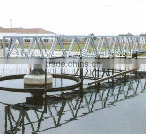 This equipment is peripheral drive. the sewage radial flows through the central pipe of the pool the spreaded by the distrubutor tube then the suspended mud can deposite. the driving device can revolove with the working bridage the scraper arm and the board can move together at the same time. The scraper board gathers the mud together and the pipe discharges the mud into the central mud tank by the water pressure bearing in the pool. the mud releases outside of the pool through the mud pipes. the suspending fross floating leads to the dross hopper through the revolving device for scrape dross. the supernatant release through the outlet trough from the triangle outlet water weir.