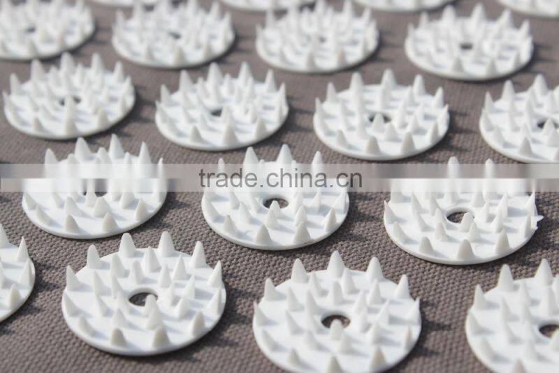100% non-toxic, non-allergic ABS plastic button has 42 nails and on a standard mat 210 buttons are precisely arranged without the application of glue. In order to get a solid bonding of the spike buttons, which is a perennial problem with the glued spikes, a specially developed machine is employed to heat bond the buttons. No toxic glues and chemicals are used to glue plastic to the mat.