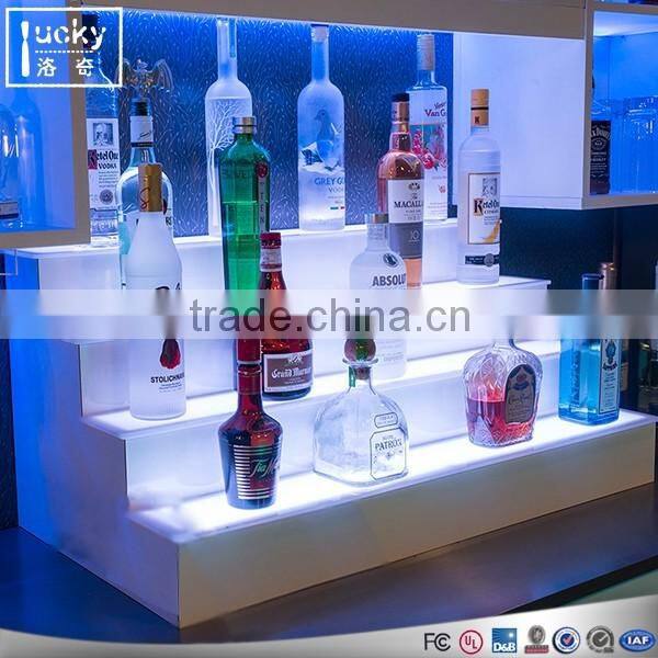 Update the look of your bar with this 3-tiered liquor bottle display shelf (available in lengths from 2 to 6 feet). Thefully encased LED lighting, controlled by a wireless remote control, bathes your premium bottles in endless combinations ofcolor and lighting effects to highlight their general awesomeness. The solid, liquid resistant acrylic constructionutilizes an ultra-modern flame polishing technique to eliminate sharp edges that may otherwise nick up your walls orfingers, and the multi-tier design ensures you’ve got all the room you need to keep your most popular bottles convenientlywithin reach. If you need an instant game-changer for your bar, club, or home drinking hot spot, this is the liquor bottledisplay shelf you’ve been waiting for!