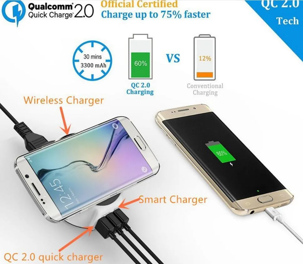 QC2.0 Portable 3 Ports Cell Phone Charger+QI Wireless Phone Charger Station for iphone samsung htc lg nokia google moto