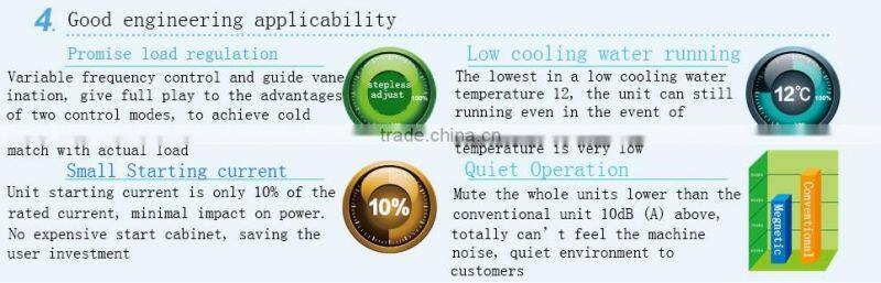 Gree CC series Magnetic levitation DC inverter centrifugal water chillers,range of refrigeration capacity 130RT-1000RT, Unit at full load up to 7.19 coefficient of performance COP, part load comprehensive energy efficiency coefficient IPLV up 12.06, is the highest in the industry. Magnet synchronous motor, two-stage air-supplying enthalpy-adding, direct-drive motor impeller, full loading hydraulic evaporator ,and other applications of much leading technology, which greatly enhance the energy performance of the unit. using the aviation industry grade magnetic bearings to replace the traditional mechanical bearings, oil-free refrigeration system to achieve the operation, to avoid the complexity of lube oil system, to further enhance performance. Advanced and reliable industrial-grade computer control system, strong group control technology and building communication interface, ensure the unit's excellent operating performance. March 7, 2014, by the authority of the international expert group identified that Gree developed maglev frequency centrifugal refrigeration compressor and water chilling unit is world leading. The unit can widely be used in air conditioning system of hotel, auditorium, office building etc.