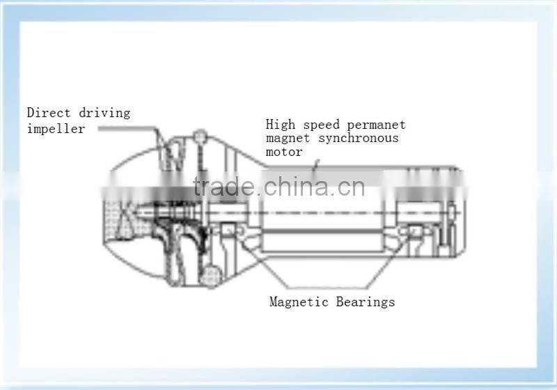 Compressor adopt high-speed motor direct-drive dual-stage impeller, cancel overdrive gear, the entire refrigeration system is only one moving part, improve the reliability of the unit from the source. Compressor using the aviation industry grade magnetic bearings , the rotor is in a suspended state in the running, to avoid bearing friction, no structural vibration, low noise running. Bear no maintenance in unit service life. meanwhile avoiding the management and control of lubricating oil, improve the reliability of the unit