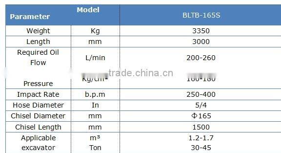 Spicification of BLTB-165 Side Type Hydraulic Hammer with 165mm chisel for 30-45 Ton excavator
