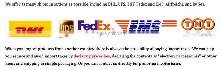 We offer as many shipping options as possible, including DHL, UPS, TNT, Fedex and EMS, Airfreight, and by Sea.