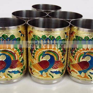 ROYAL PEACOCK DESIGNED STAINLESS STEEL MEENAKARI 6-GLASS SET -G.M. (2.5" x 2.5" X3.67" INCHES)