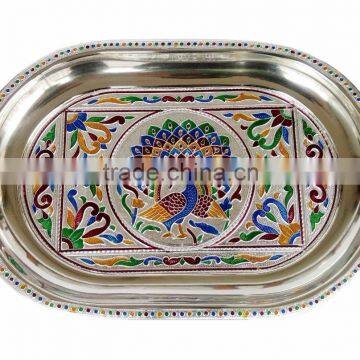 ROYAL PEACOCK DESIGNED STAINLESS STEEL MEENAKARI DECORATIVE TRAY - RP-1 SILVER (8.35" x 12.50" x 0.87" INCHES)