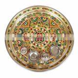 HEART DESIGNED STAINLESS STEEL MEENAKARI DECORATIVE PLATE/ PUJA THALI-GOLDEN MEENA WITH 4 TUMBLERS (12" x 12" x 0.75" INCHES)