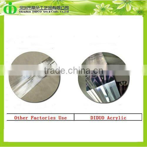 Established in 2010, Shenzhen DIDUO Arts & Crafts Co., Ltd. is located in Shenzhen, China. We have a factory covering an area of more than 2,000 square meters. We are a professional acrylic (plexiglass,organic glass,perspex,or lucite) manufacturer which specializes in acrylic designing, sampling, manufacturing and selling. We respect the talents and focus on the acrylic industry, boasting a professional team which has participated in the field for years. We have top-grade facilities and technologies of laser cutting, laser engraving, ink-spraying, silk screen printing, heat bending, jointing, and mold making. All the processes are completed in house. Our main products are acrylic lecterns (podium),acrylic furniture,acrylic display box(case)acrylic bakery cases, acrylic cupcake stands, acrylic cosmetics & jewelry displays, acrylic electronic & watch displays, acrylic photo & picture frames, acrylic brochures & calendar holders, acrylic office & household supplies, acrylic restaurant & hotel supplies, and crystal products. We can help our customers to design and manufacture different kinds of acrylic products which are popular in the overseas markets. We have broadly obtained the advantages from others and provide our dear customers with hospitality. The concept which helps our company to develop is "Advanced Technology, The Best Quality,Satisfactory Service, Sincere Cooperation and Co-development". To be one of the pioneering Arts & Crafts suppliers of China is the dream that we are pursuing, and DIDUO people are always endeavoring to achieve it!