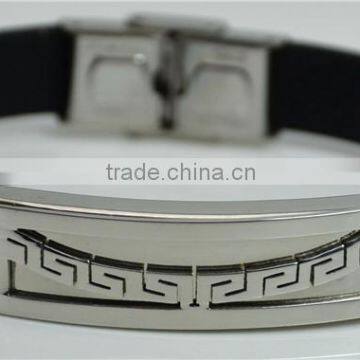 Simple Fashion Smooth Stainless Steel Bracelets Black Leather Wrist Bands Metal Buckle Weld Arc Shape Chinese Pattern Bracelets