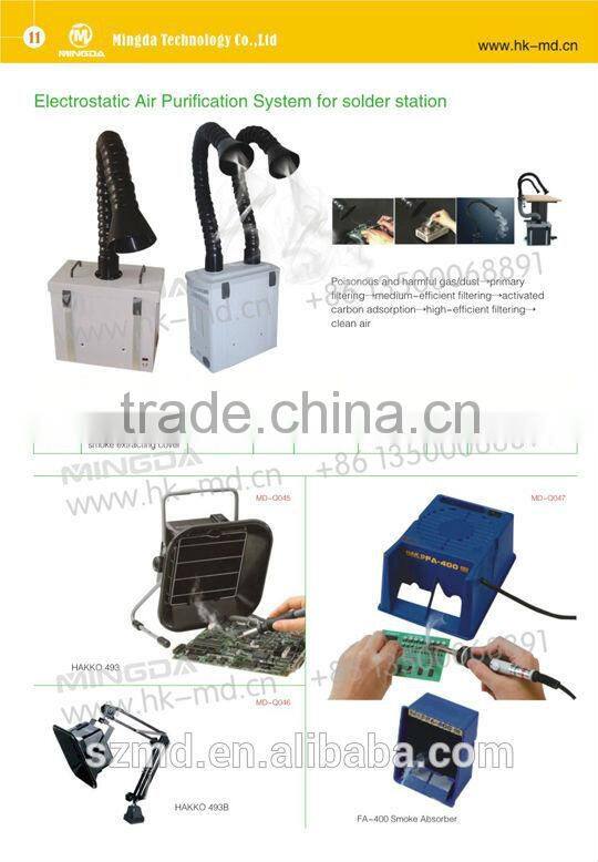Our company is a enterprise which is professional in Electronic environmental protection equipment development. Our main business is produce Smoke purifying filter, Odor filter, Smoke purifier, Dust collection system. Our product are suitable in all the places which cause smoke/offflavors/dusts/poisonous gas etc. These places include factories that produce electronic products/LED/toys/ precise metal/cars/laser work/metal polish/medical treatment etc. Our products adapt changeable single/double stations and multiple filtration equipment, including primary/medium/high efficiency filter (HEPA). Our machine can be adjusted by its stepless regulator according to the amount of exhaust gas produced. Purifying rate 99.97%, the purified air can be released directly inside rooms. MD3101A ESD smoke absorber /MD3102A ESD smoke absorber are designed for solving these problems above.