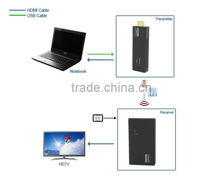 LM-WHD50 Wireless Audio Video Transmitter Receiver is a high quality Wireless HDMI product, small size and easy to use. This Wireless Audio Video Transmitter Receiver includes one transmitter and one receiver, no needed WI-FI, supports VGA, SVGA, XGA and 1080p video format, can extend HDMI signal up to 50m, powered by USB.