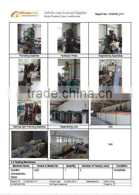 We have professional testing equipments such as anechoic chamber, LMS, DAAS, CLIO etc. The company has 10,000 square meters of standardized workshop and special processing equipments: 3CNC spinning equipments, 1 powder painting production line, as well as dozens of automatic check and process equipments. Innovation, remarkable, dedicative is our consistent working style. We will provide OEM &ODM services with more innovation, profession, exquisiteness, and satisfaction.