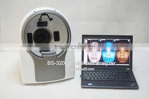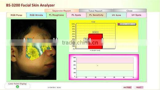 The BS-3200 magic mirror system is one of the advanced images analysis system in the world, using digital images technologies via RGB, UV and cross PL (polarized light) spectrum. Magic mirror systemcan diagnose a lot of face problems: Like spot, pore, pigment, wrinkle, crease, dye, ultraviolet ray or sunshine etc. To bring the damage with different degreeto skin, hurting skin accurately the circumstance present at the front of client, and offer one set of medical suggestion for the client; Also can compare thedifferent client face images before and after skin care.