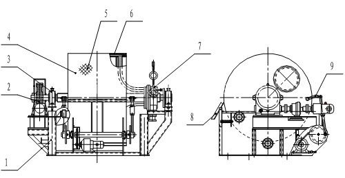 1trough,2 body transmission device,3main bearing,4rotary drum,5filter cloth,6filter plate,7vacuum head,8 scraper,9mixing scraper: