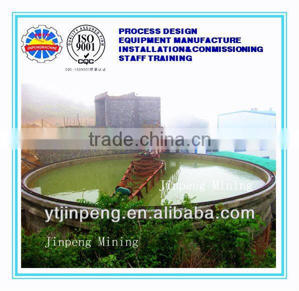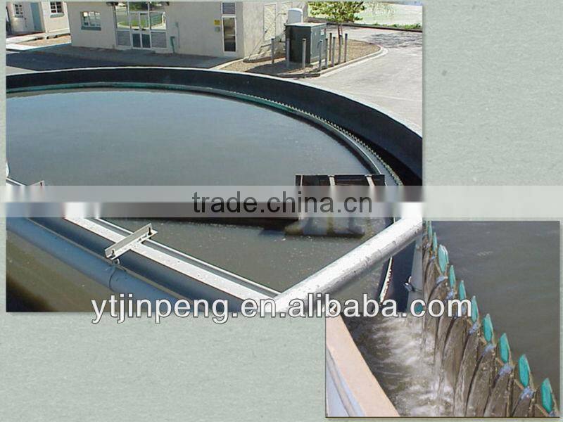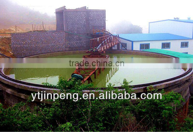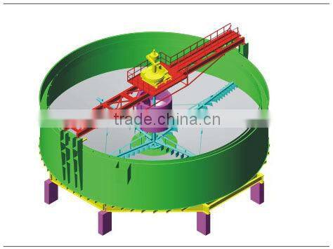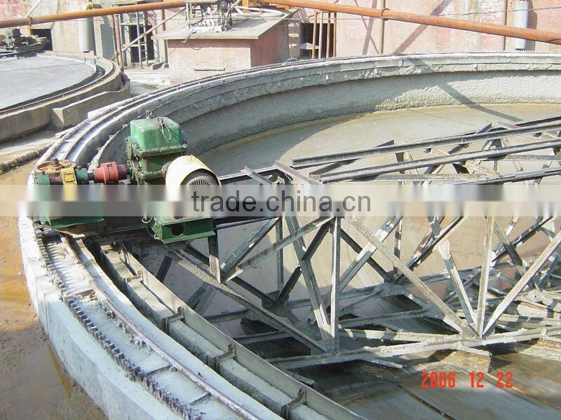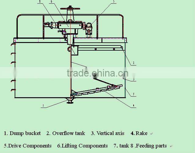In the bottom center of a discharge concentration of the product discharge bucket, pond surrounding the upper ring with the overflow tank. Concentrated in the central pool has a vertical axis, the axis of the cross at the end of a fixed frame rake, rake the following aircraft equipped with a scraper. Rake into a horizontal plane and 8 ° -15 °. Fixed by the vertical axis in the truss on the motor reducer by the middle gear driven rotary. When the vertical axis rotation, the pulp along the truss to the mine shafts into the center of the bowl pool, and to concentrate around the pool flows. Pulp in the settlement of solid particles gradually condensed into the bottom of the pool by the following scraper plane rake scraping into the center of the pool discharge bucket with sand pump. To clarify the above clarificationwater from the Department of the Central Bank out of the overflow tank. In the thickener have been concentrated load or materials, the discharge will fight blockage and rake frame distortion. To prevent this phenomenon, there are signals of safety devices and equipment to upgrade rake frame.