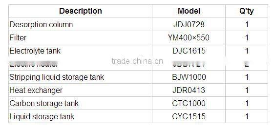 Main equipment of this system includes desorption column, filter, electrolytic bath, circulating pump, electric heater, heat exchanger, stripping liquid storage tank, carbon storage tank, electric control