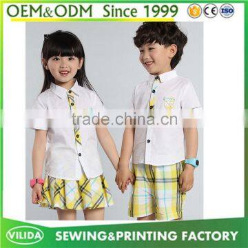Hot selling kindergarten uniform new fashion primary school uniform white shirt and yellow checked shorts or skirt