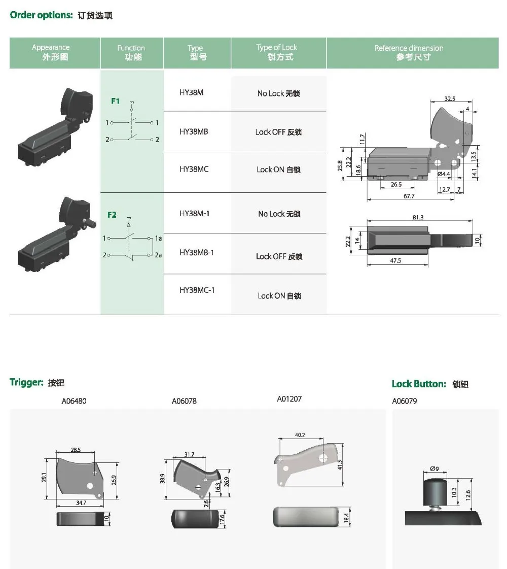 HY38M Series are used forTable or Portable PowerTools with high ratings with functions of DPSTand SPDTwith braking.1e switch with DPDT contact is appropriated for braking system.lt is charac rized by double-braking system different triggers & lock buttons.screw terminals.