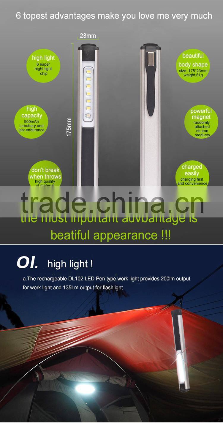 a. The rechargeable DL102 LED Pen type work light provides 200lm output for work light and 135Lm output for flashlight.