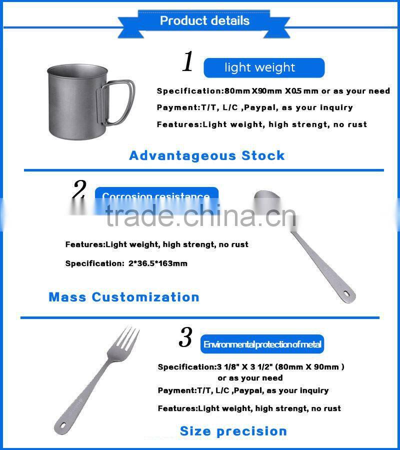 Titanium cutlery with a light weight, high strength, high temperature, high temperature strength, good low temperature performance, acid properties. Green and healthy metal production, combined with titanium tableware made of industrial technology can keep the food authentic, colors, conducive to human health; light weight and easy to carry to ensure healthy outdoor travel time for more effective protection. (Titanium with the "pro-biotic", non-toxic non-magnetic.)