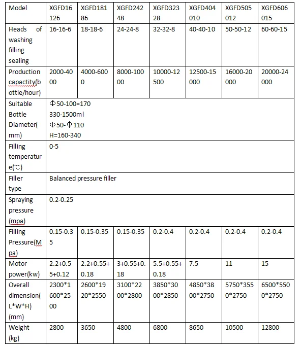 This machine is suitable for gas beverage packaging, has the following features: filling cylinder, such as the filling valve of direct contact with the material parts adopt high quality stainless steel or non-toxic materials manufacturing, comply with the food sanitation standards;Sealers adopt heat resistant rubber, satisfying the requirements of the user process of high temperature disinfection;Adopt PLC programmable controller, realized from the bottle into the fully automatic machine and finished packing, using the frequency changer control variable frequency speed regulation control, easy to adjust the equipment users, meet the requirements of the different process of production capacity.Adopts isobaric filling principle and popular spring valve, to ensure that the beverage quality, adopting the advanced magnetic clutch adjustment screw torque device, to ensure the quality of the block.