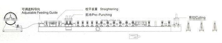 1. decoiling → guiding and feeding → straightening/leveling→pre-cutting →punching(optional) → roll forming→run out table