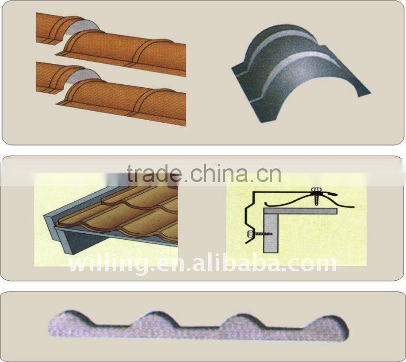 There is a sealing profile available for sealing the gap between the wall sheet and the roof-tile panel, the “positive ”type.A flat foam profile is provided for the cut-off between the verge flashing and the sheet. Another “negative”type is available for the cut-off between the ridge tile and the roof-tile panel.